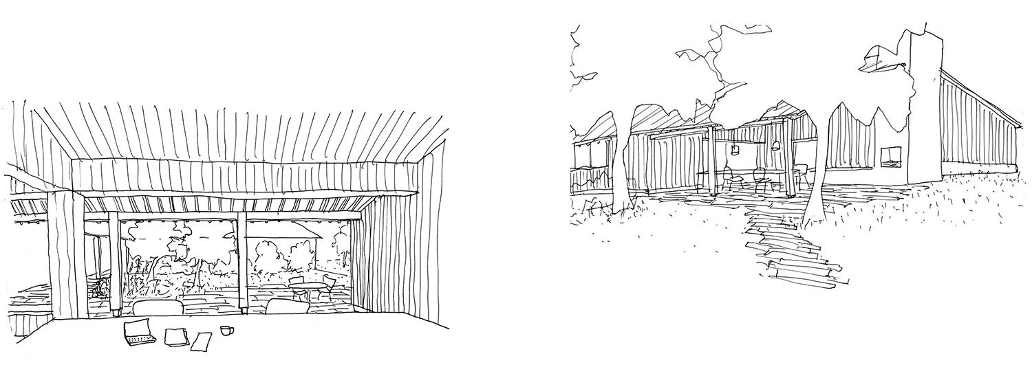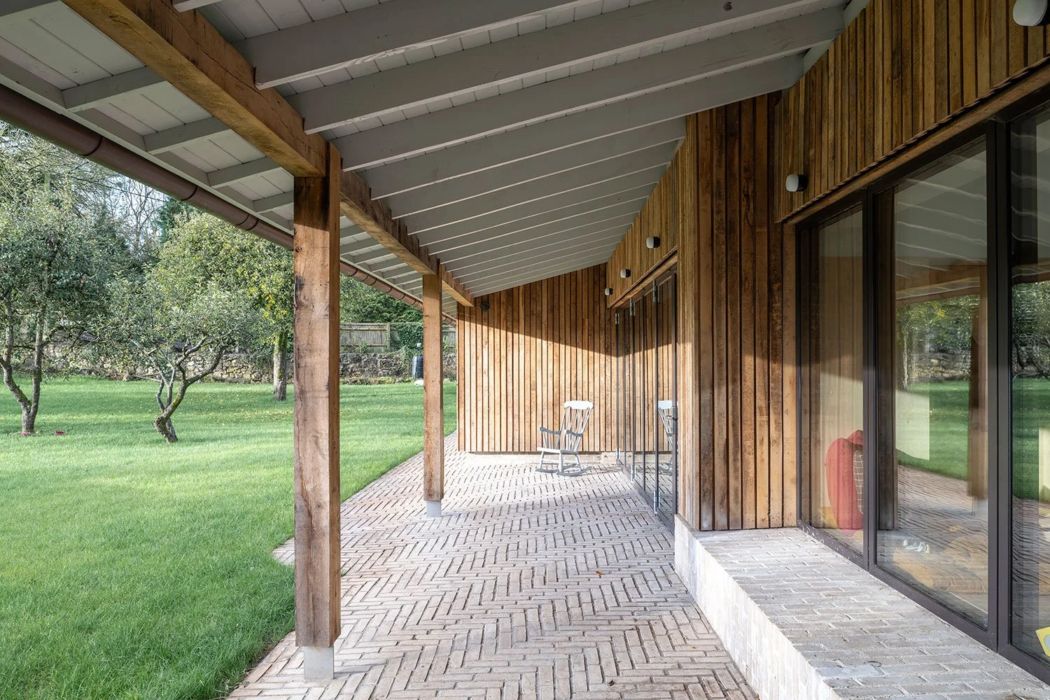 A brick plinth raises the timber frame above the ground, mediating between the landscape and the house. In places the plinth morphs into larger brick elements - a window seat in the loggia, a bench by the front door, that anchor the house in the site. In several places the roof or brick paving project beyond the walls to form sheltered outdoor spaces, intermediate territories that blur the distinction between the house and the landscape. The microclimate of these spaces extends the domain of the house and the season when life can be lived outdoors, offering places to find shade, to eat or work, to dry washing or for storage.